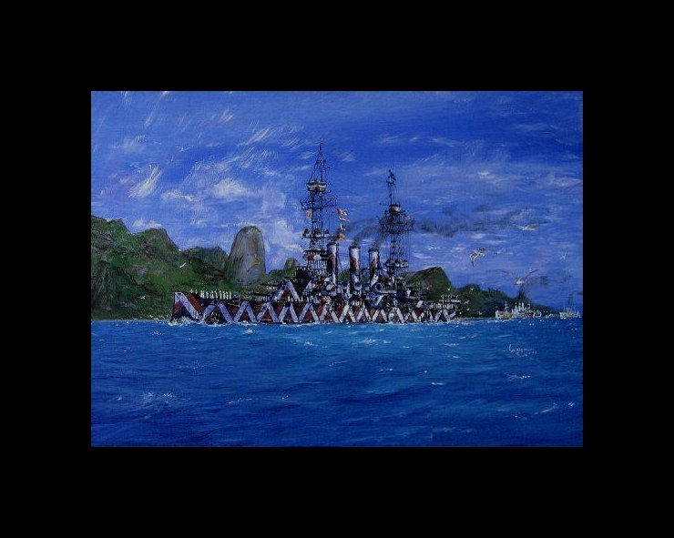 USS Nebraska BB19 wearing a Norfolk No. 3 camouflage pattern. The ship is escorting a convoy to Rio de Janeiro in 1918