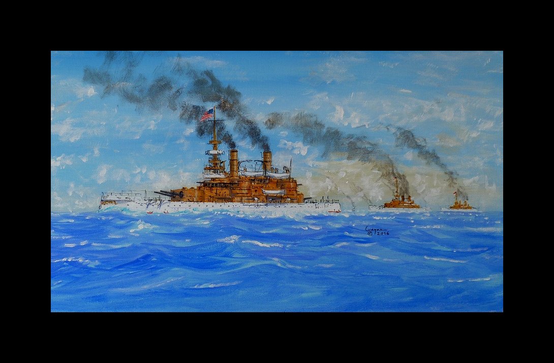 USS Massachusetts BB2 in the white and buff paint of the Great White Fleet steaming with the Battle Line in 1905
