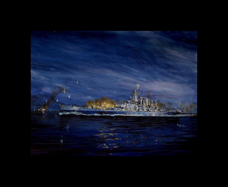 USS Washington BB56 engaging the Japanese battleship Kirishima at the NIght Battle of Guadacanal in Nov 1942