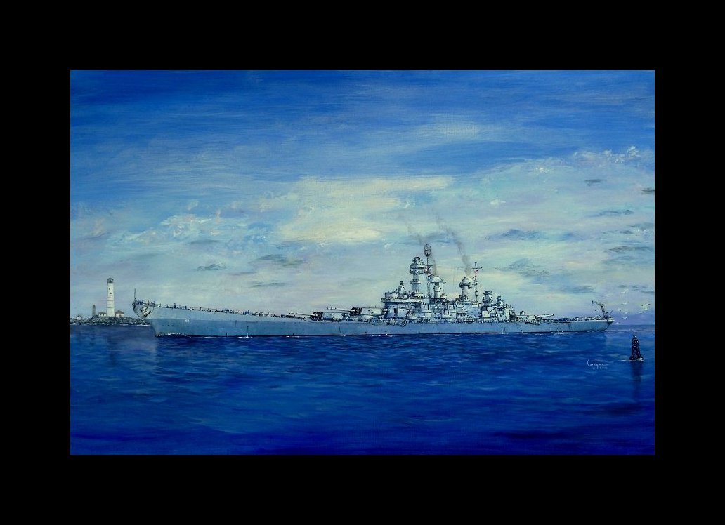 USS Alabama BB60 getting underway from under the towering crane at the Norfolk Naval Shipyard where she was built