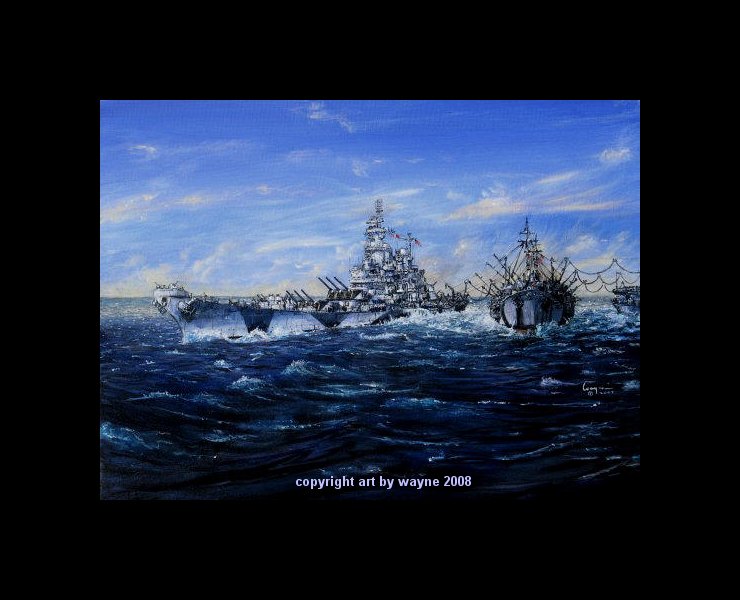 USS Iowa BB61 taking aboard fuel from an oiler while underway in 1944