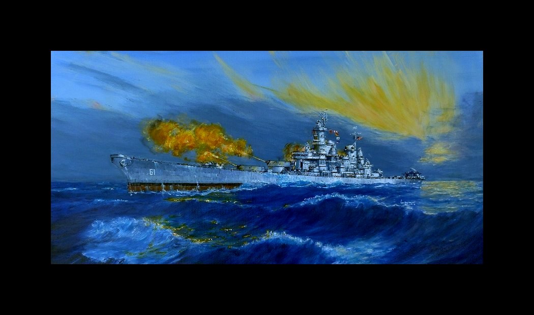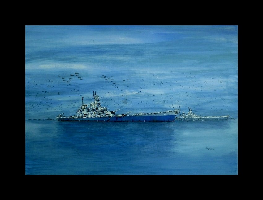 USS Iowa BB61 and USS Missouri BB63 on 2 September 1945 as the aircraft of the US carrier force fly over Tokyo Bay to close out the surrender ceremony