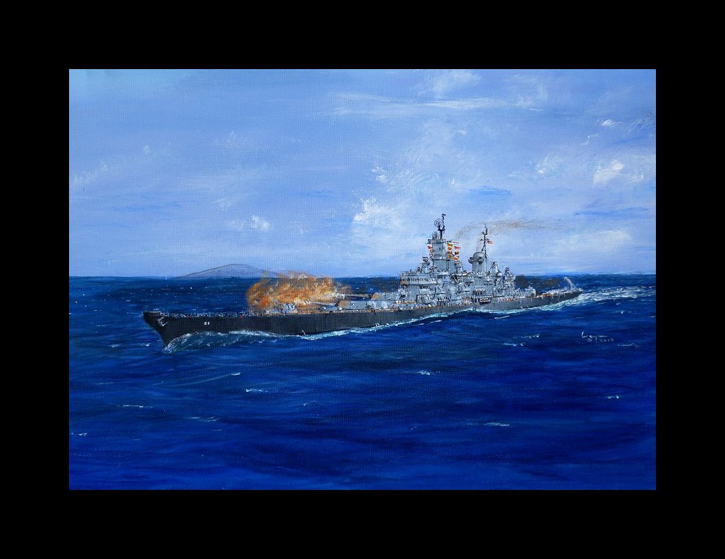 USS Iowa BB61 leads the New Jersey, Indiana and Washington during the bombardment of Eniwetok Island in 1943