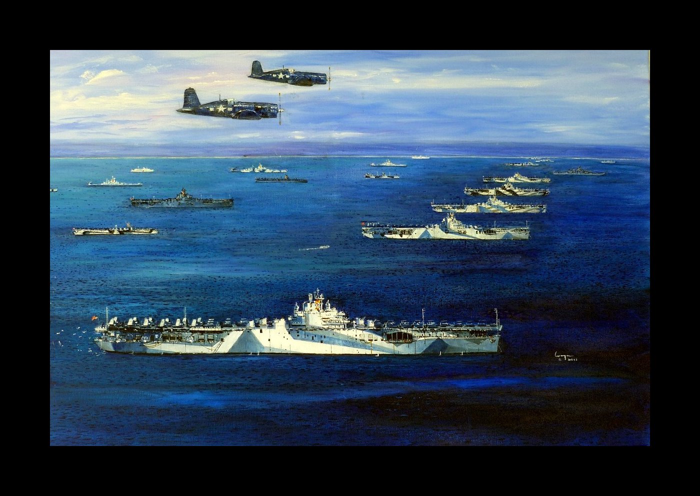 USS Yorktown CV10, USS Hornet CV12, USS Wasp CV18, USS Hancock and USS Ticonderoga CV14 with USS Lexington CV16 at Uithi Atoll in 1944