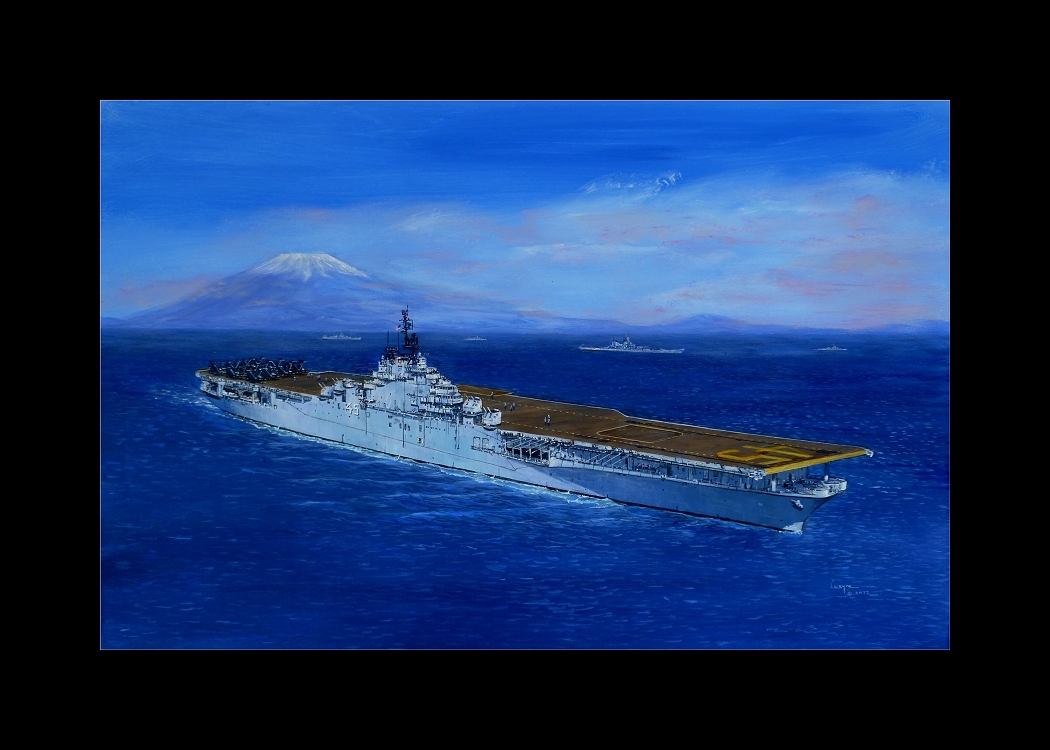 USS Valley Forge CV 45 off Honshu Japan in 1947 with Mt Fuji in the background on a Western Pacific cruise