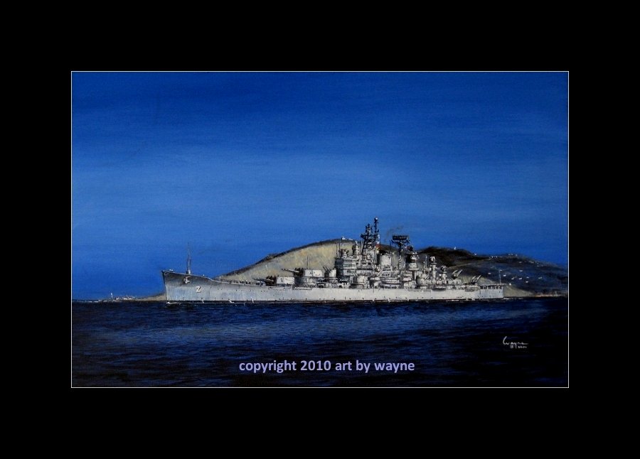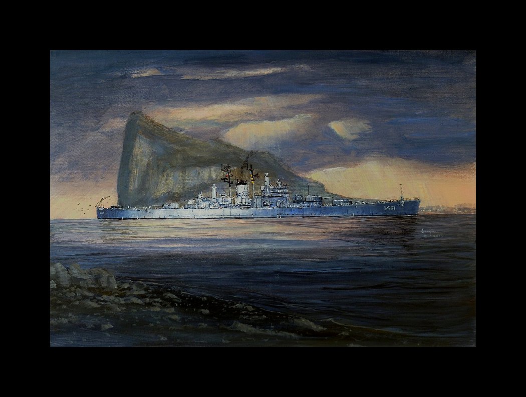 Heavy Cruiser USS Newport News CA148 stately steaming into the Mediterranean passing the Rock of Gibraltar