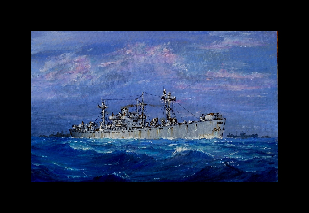 Liberty Ship SS Kit Carson getting underway in the southwestern pacific with her escort USS Carson City PF50 in the background