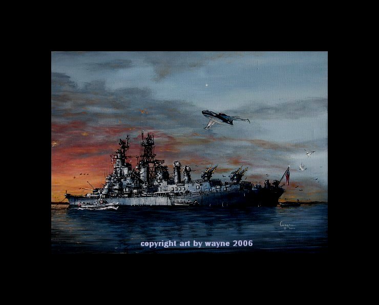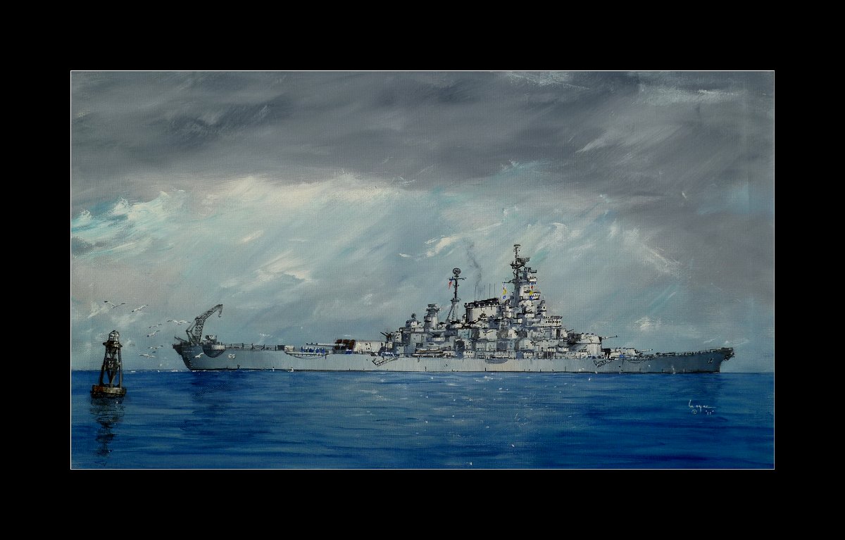 Ballistic Missile Monitor USS Wisconsin BB(MG)4 leaving San Diego for a deterence patrol. The ship is fitted with 12 Jupiter S IRBM stored vertical in the housing amidships. Overhead is a Convair TY1 Pogo VTOL fighter