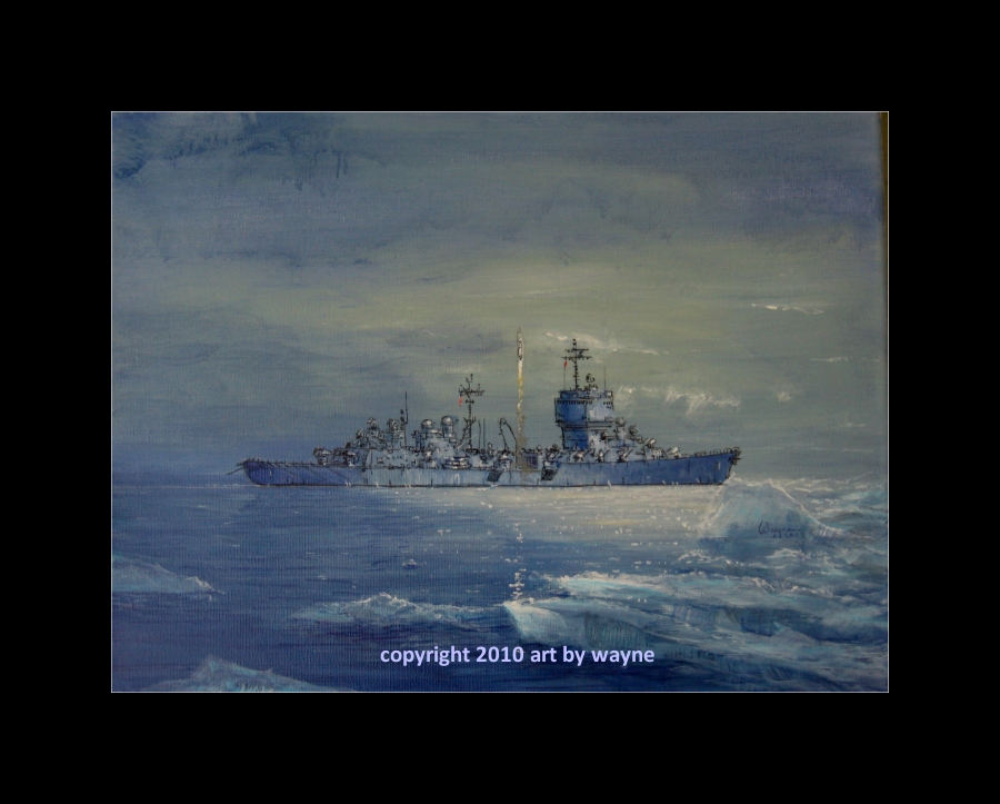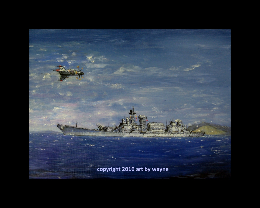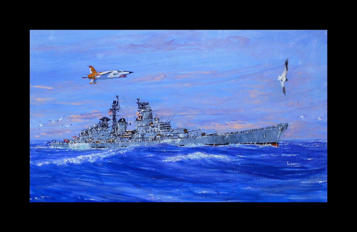 Guided Missile Battleship USS Kentucky BBG1 in an SCB140 single end Talos SAM missile conversion retaining the two forward 16" turrets. Flying by is a cancalled Crusader II fighter