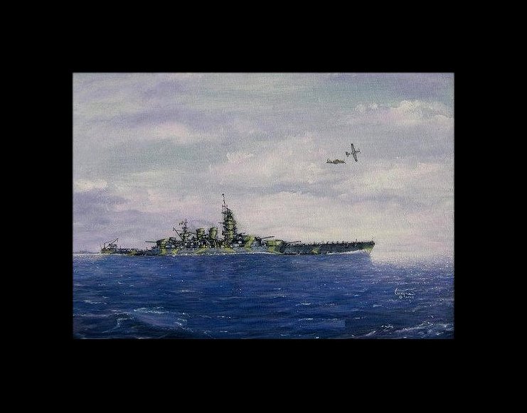 Italian Battleship Vittorio Vento 1943 at sea on an anti-shipping sweep. Topcover is being provided by two Macchi MC.202 Folgore fighter