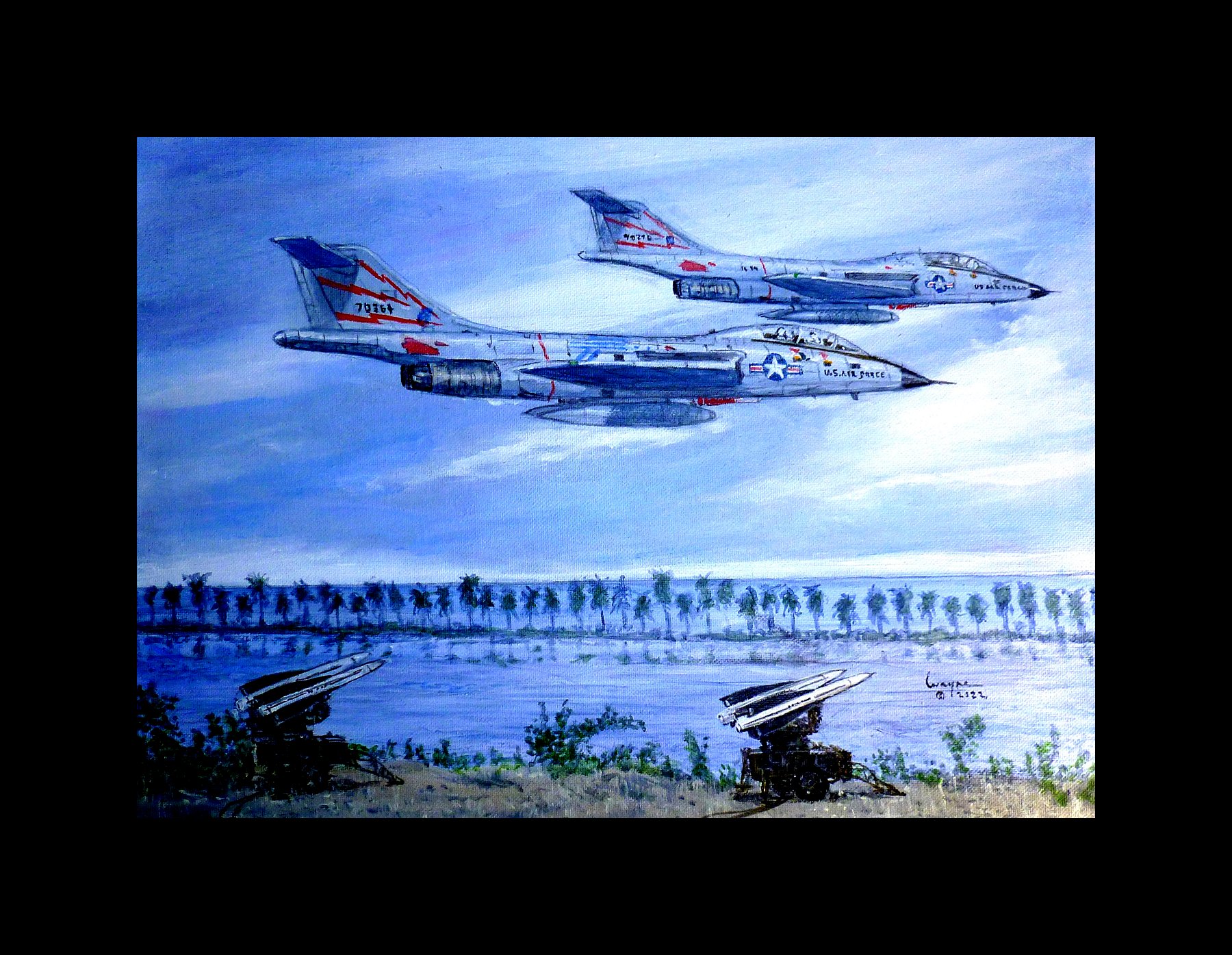 Two McDonnell F101B Voodoos streak over US Army HAWK missile launchers at Key West during the Cuban Missile Crisis in Oct 1962.