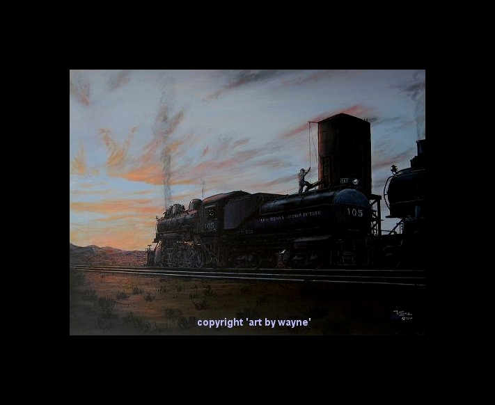 2-8-0 No.105 takes water at Ocotillo Wells in a warm summer evening in 1949